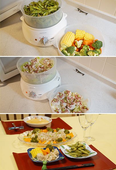 蒸すときにはフードスチーマーが大活躍。水を入れてタイマーをセットするだけでOK。とうもろこしなどの夏野菜も一緒に蒸し上げれば、おいしい上に栄養もたっぷりです。蒸した枝豆はアレンジ自在の便利食材として活用できます。今回はシュウマイの具材に使ってみました。枝豆づくしの食卓に、みんな大喜び。今日もおいしくいただきます。