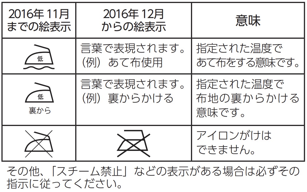 ①熱に弱い繊維(化繊、絹、毛など)にアイロンをかける時は、当て布をするか、目立たない部分に「ためしかけ」をして異常のないことを確認してからご使用ください。