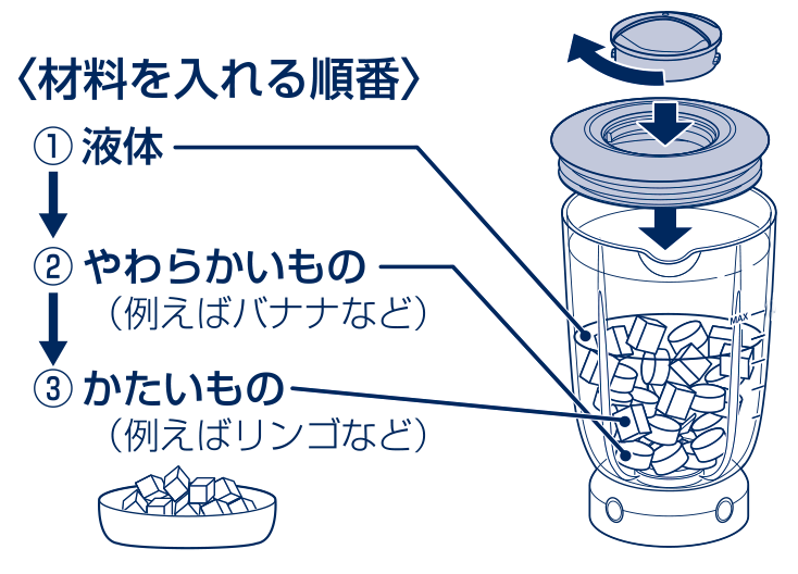 角氷を加える場合は、2.5㎝角以下のものを3個以下にし、他の材料の後に入れてください。